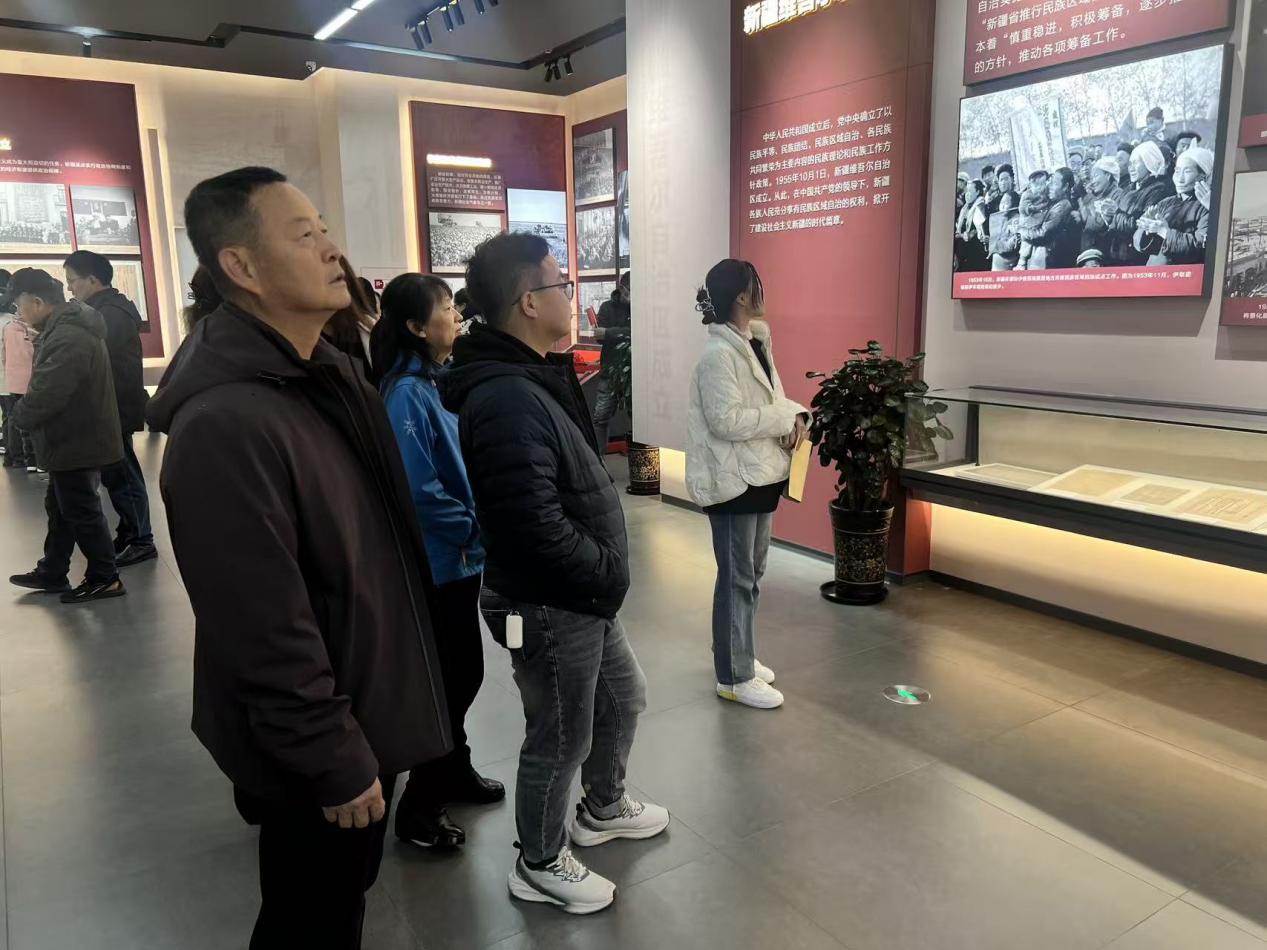 展览以“万方乐奏换新天”、“潮涌天山展宏图”、“美丽新疆铸辉煌”三大篇章为核心,全景呈现新疆从百废待兴到百业兴旺的跨越式发展。聆听讲解员讲述从万方乐奏有于阗古老的乐舞见证的文化交融,到中欧班列乌鲁木齐国际陆港区集结中心到现代物流枢纽展现的经济腾飞......通过此次参观大家深刻领悟到新疆这七十年的缩影,七十载的沧桑巨变,不仅直观地体现在数据变化里,更写照在人民的幸福生活中,新疆的建设发展,始终离不开祖国的关心支持,新疆人民在党的领导下,手拉手、心连心,以团结为笔、以奋斗为墨,从百废待兴的岁月里破局,在砥砺前行的征程中书写百业兴旺的动人篇章。